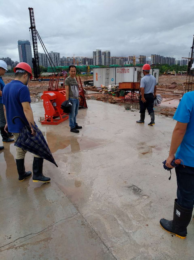 近期連續(xù)的大雨、暴雨,嚴(yán)重影響了施工。將挖好的基坑給泡了,項(xiàng)目部領(lǐng)導(dǎo)和工程師們檢查現(xiàn)場,并在雨停后指揮工人趕快抽水、排水,搶救被泡的基坑。