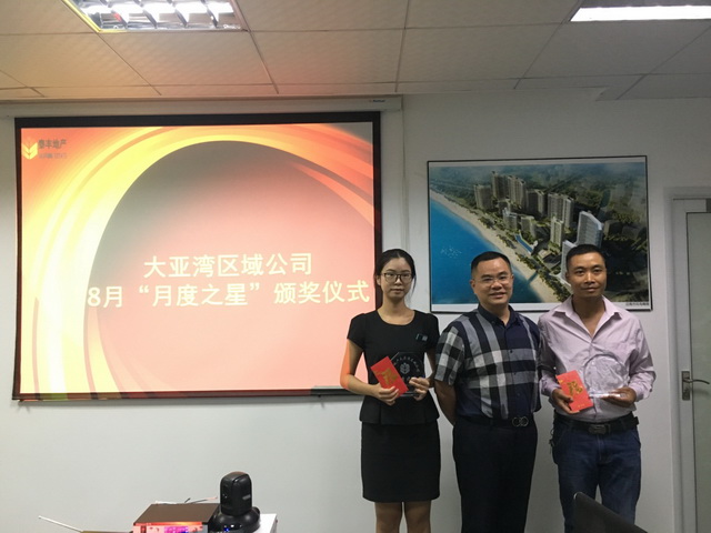 2017年9月11日,泰豐地產(chǎn)大亞灣區(qū)域公司舉辦了8月“月度之星”頒獎儀式, 區(qū)域總裁葉文治總宣讀獲獎名單及獲獎理由:李明兵對樁基礎(chǔ)的施工監(jiān)督、工程量現(xiàn)場收方工作認真負責(zé),對項目的質(zhì)量、成本有突出貢獻。何歡歡在處理泡泡海業(yè)主投訴和維修工作積極及時,溝通能力強,多次受到業(yè)主表揚。隨后為獲獎?wù)哳C發(fā)了現(xiàn)金獎1000元/人及紀念獎杯,以資鼓勵。